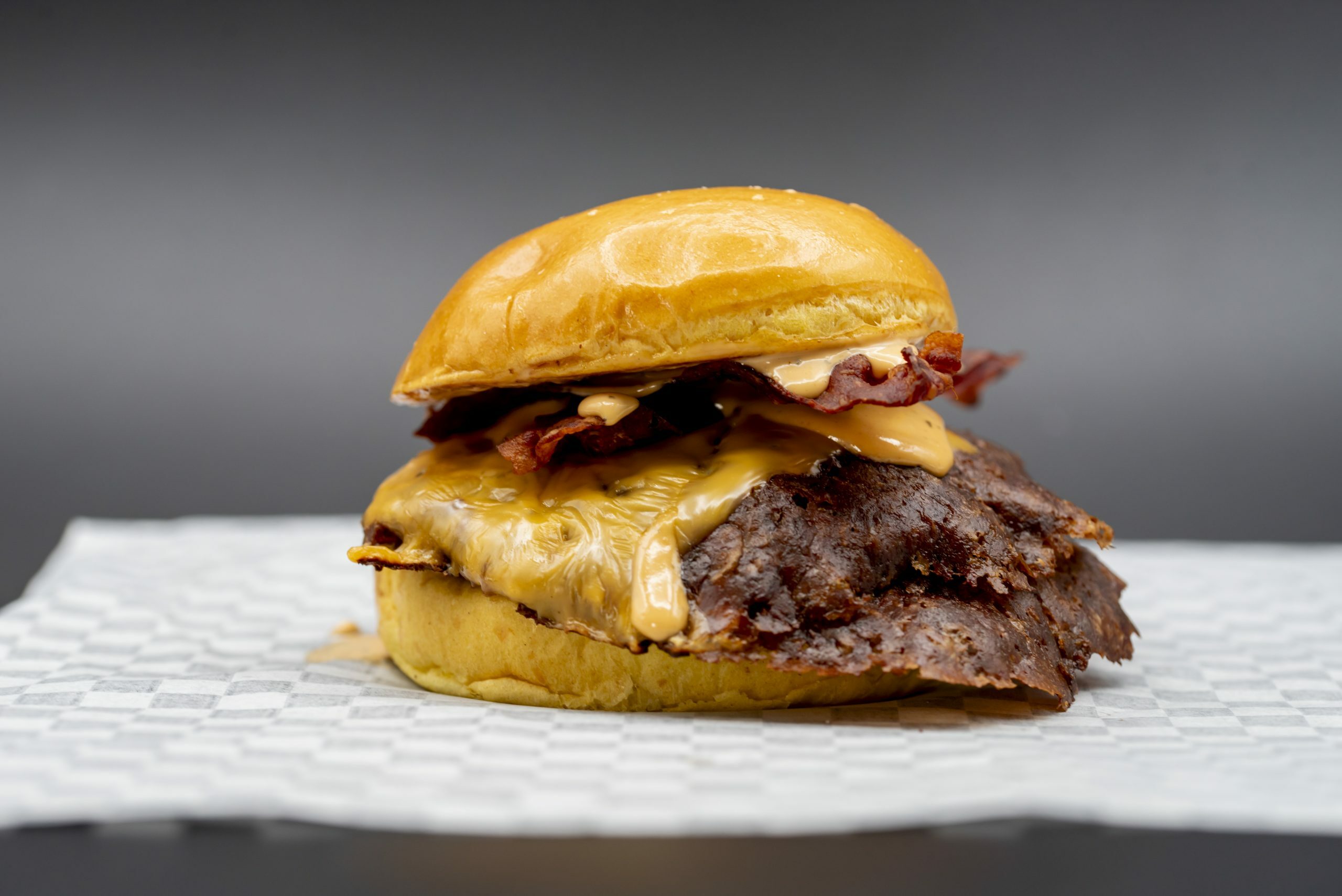 Doble smash de vacuno, queso cheddar fundido, mermelada de bacon y una salsa especial “Cuñao Style’s” que te va a volar la cabeza.